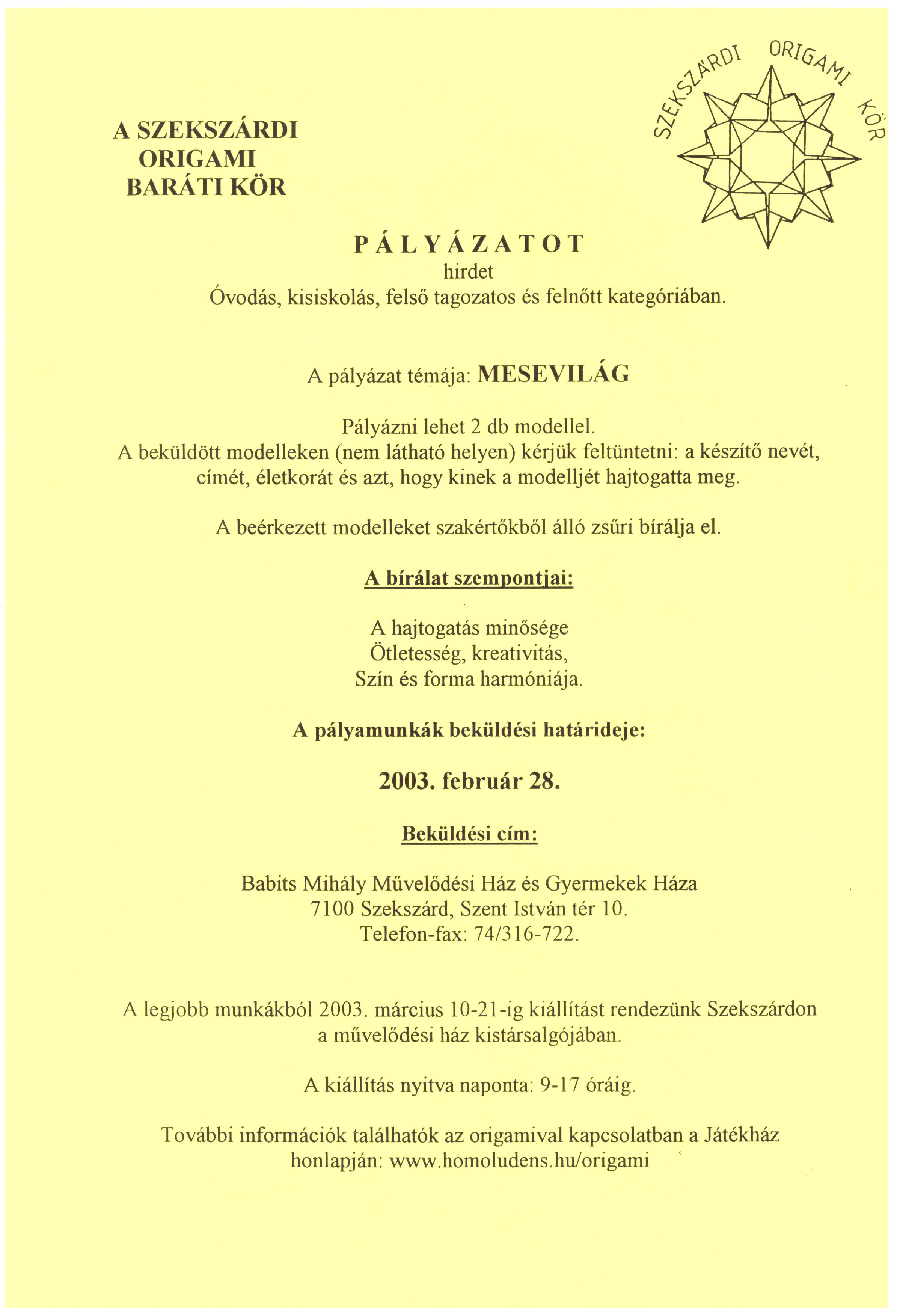 Origami pályázat - Mesevilág - 2003 2003. 01. 01. 09.00 - 2003. 02. 28. 19.00 pályázat Szekszárdi Origami Kör - Megszűnt