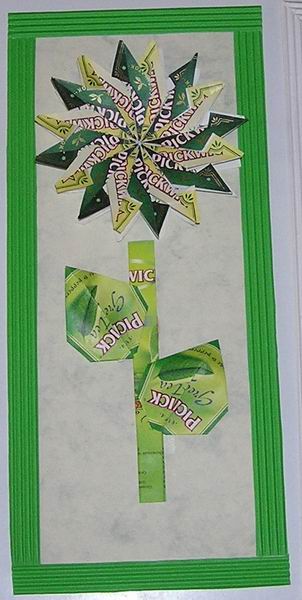 A teatasakokból vágott négyzet, vagy téglalap kiszabása után megmaradt kis téglalapokból készített virág.