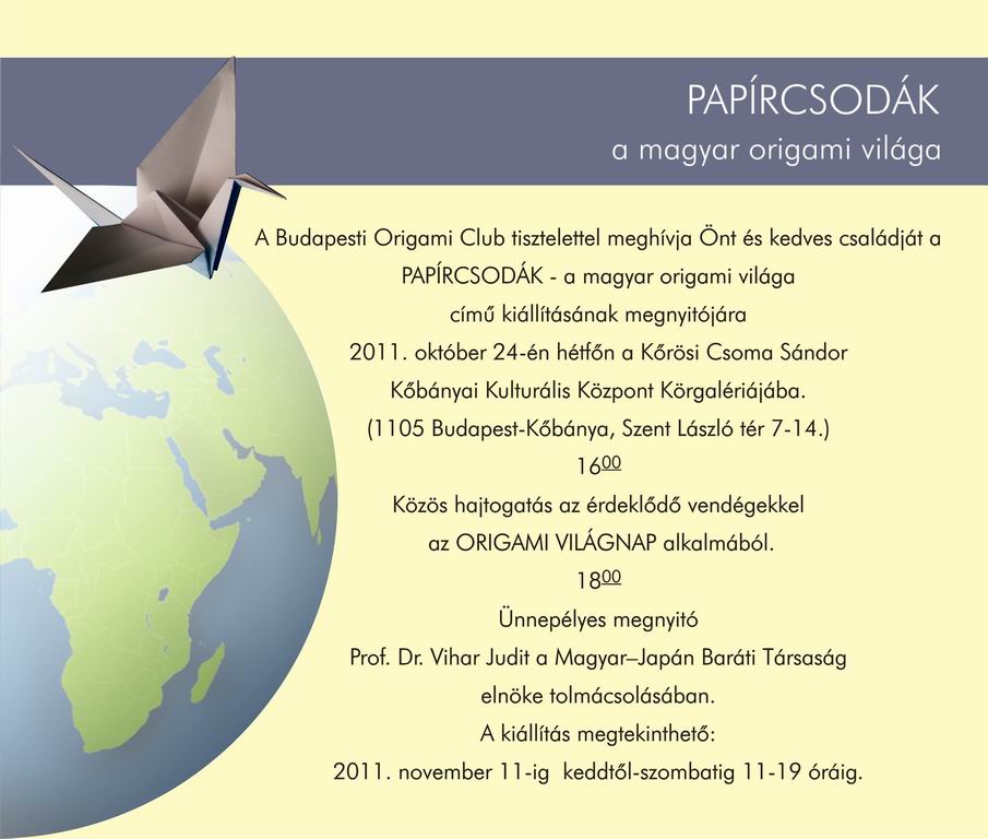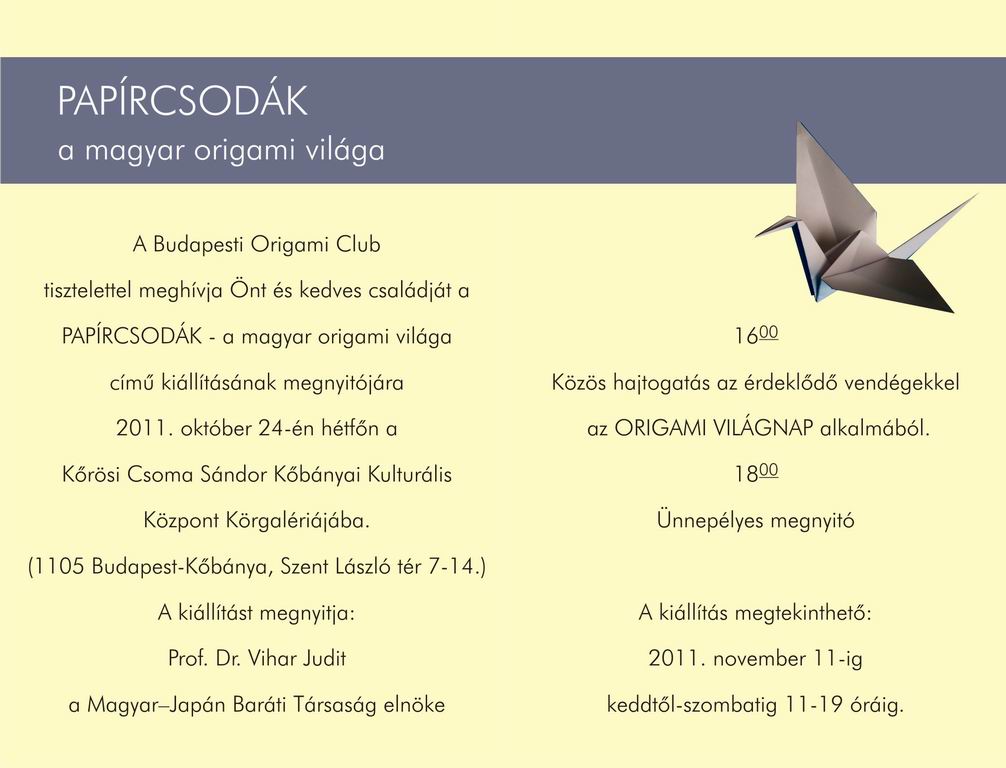 A Budapesti Origami Club tisztelettel meghívja Önt és kedves családját a