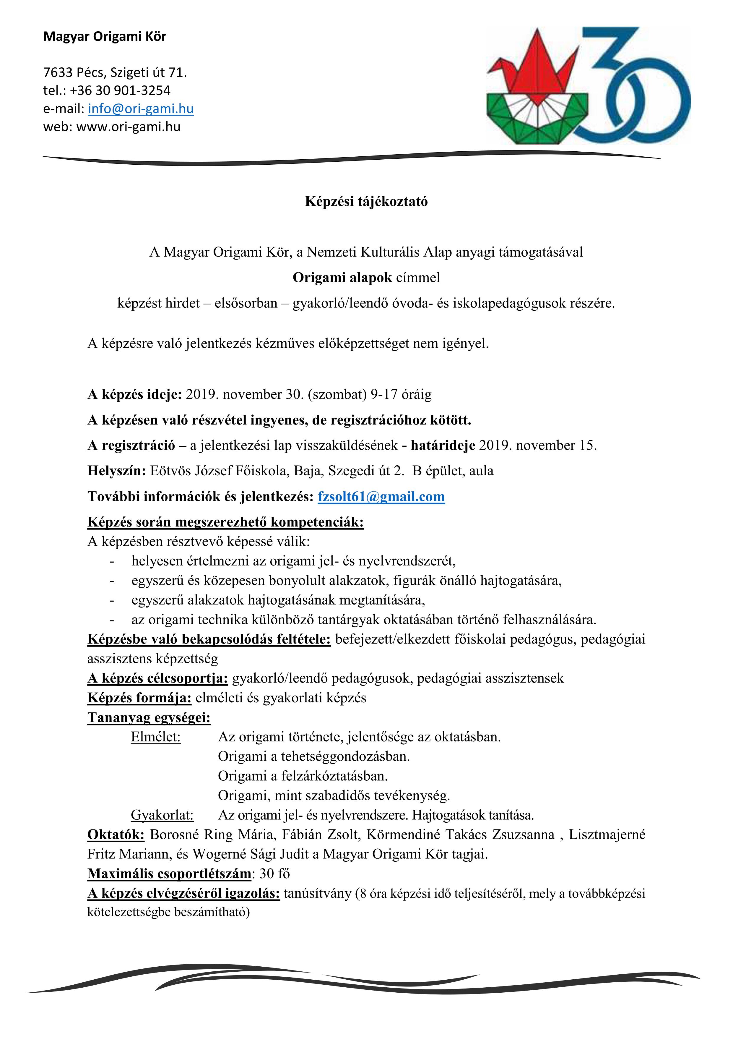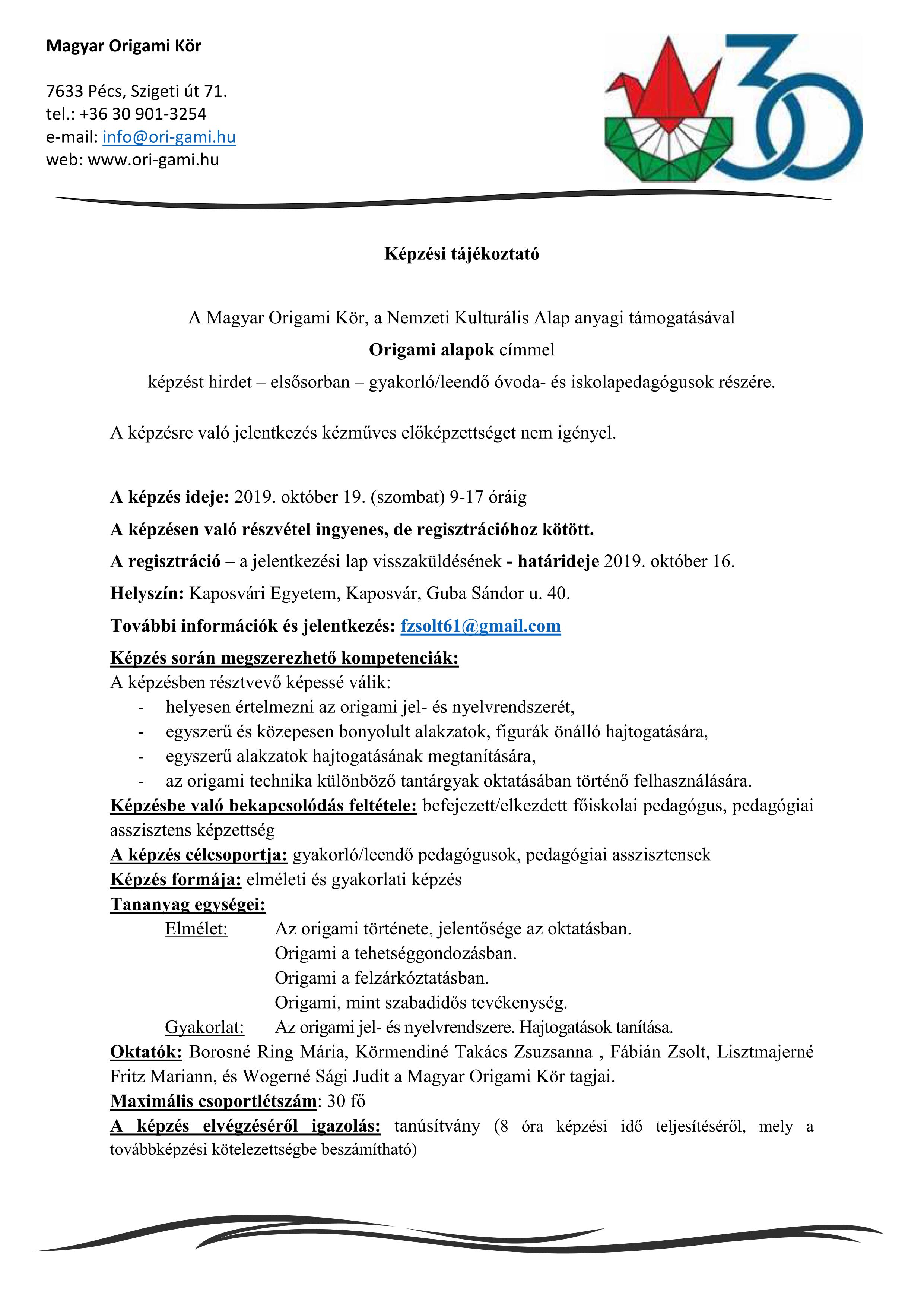 30. Nemzetközi és Országos Origami Találkozó - 2019. Pécs |